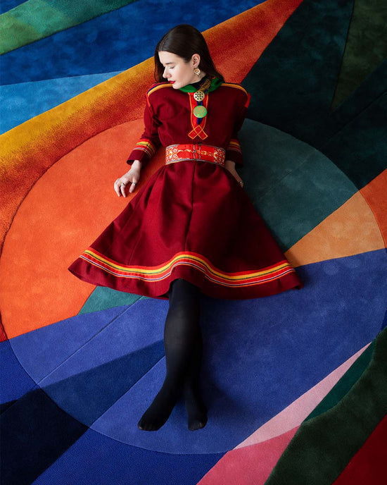 Volver worked closely with the Sami artist Laila Mari Brandsfjell to transfer her artwork and the idea of lavvo onto the carpet. The rug is hand tufted in NZ wool in gradient strong colors. The inner circle symbolizes the campfire, where the narrator will stand.