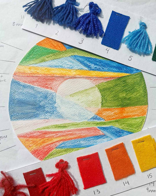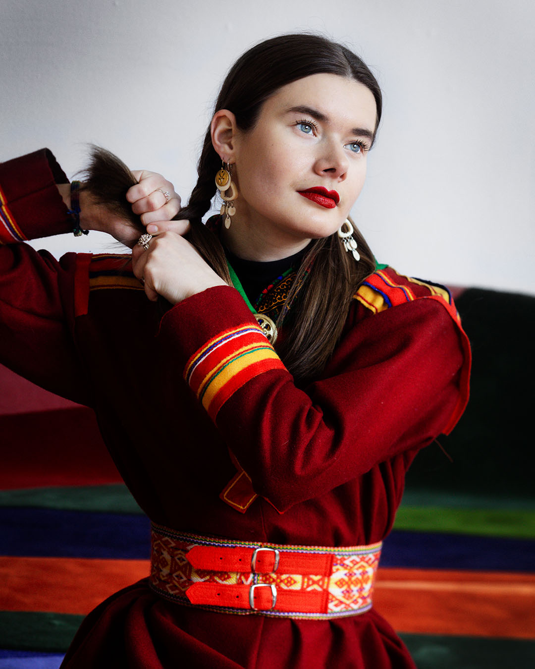 to know the artistry of Laila Mari Brandsfjell and Ida Helene Benonisen. Laila experiments at the intersection between duodji/traditional Sami craftsmanship and design, and has made a large carpet for the exhibition. The carpet is round, colorful and inspired by lavvo as an important gathering place for