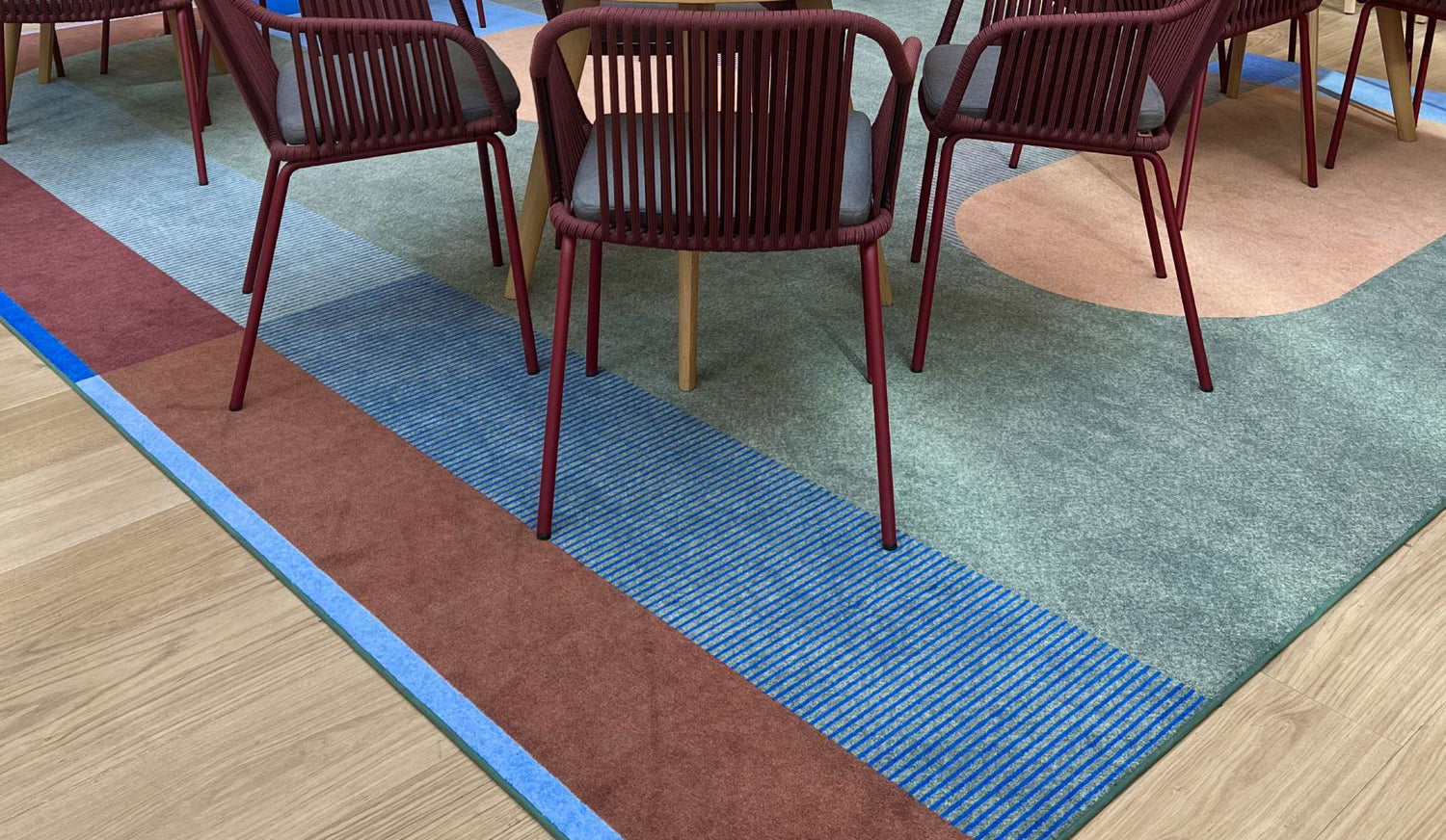 Volver has previously delivered hand tufted rugs to social sones at HQ Gjensidige, which are now complemented with HD printed rugs for canteen and lounge areas, with high requirements for traffic and cleaning.