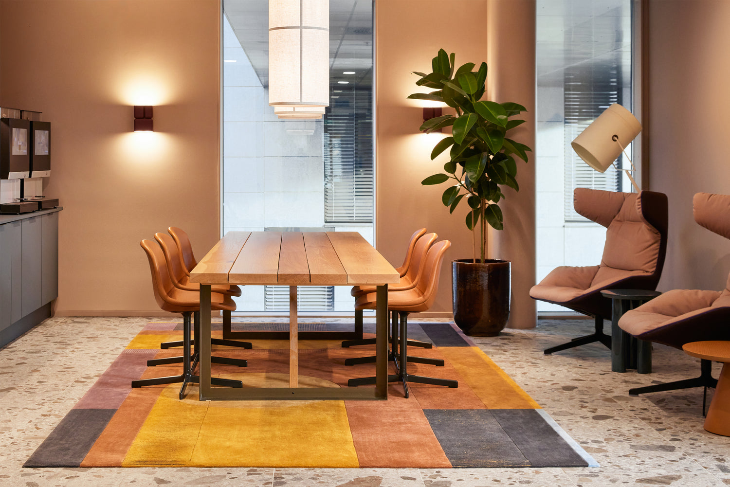 Designing rugs was a joyous journey guided by creativity and trust. The team played with bold patterns, vibrant colors, and unconventional shapes, tailoring each detail to spaces. The result? Eye-catching rugs that bring joy to work environments.
