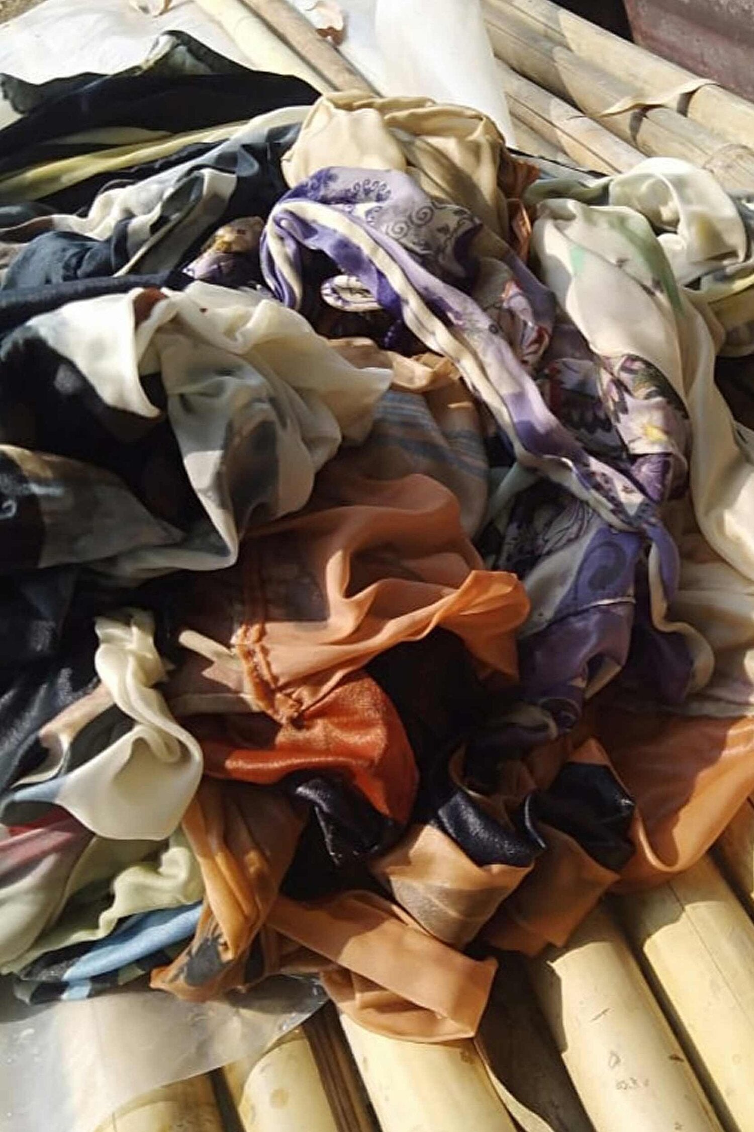 The silk scarfs, which were unqualified for sales, were processed and dyed. A special technique was developed to tuft with the shredded silk. The effect is a multicolor soft surface, still showing the original brand prints.
