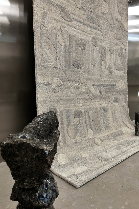The natural tones of natural undyed wool, as sophisticated grays, soft whites and warm browns are used to craft the sculptural rugs for the “Stone” collection by Kaja Dahl.