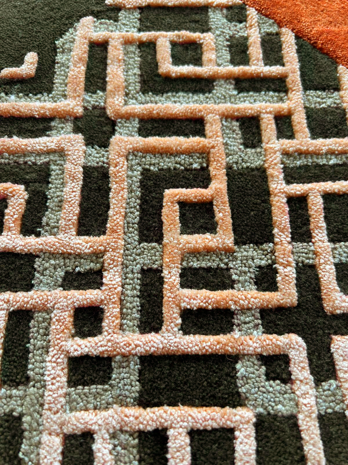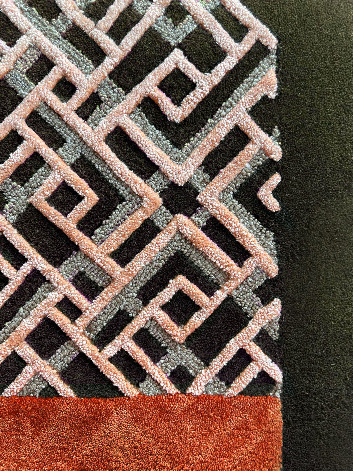 Volver seeks to reinvent this fashion iconic pattern with a new twist of pattern gradients, playing with the variations of the plaid elements. The rug also has architectural quality with horizontal and vertical orientation, making it easily suitable for modern minimalistic interiors. Volver preserves the textural quality of Chanel´s plaid textiles, combining both an open pile in bamboo silk and a loop pile in various woolen yarn shades.