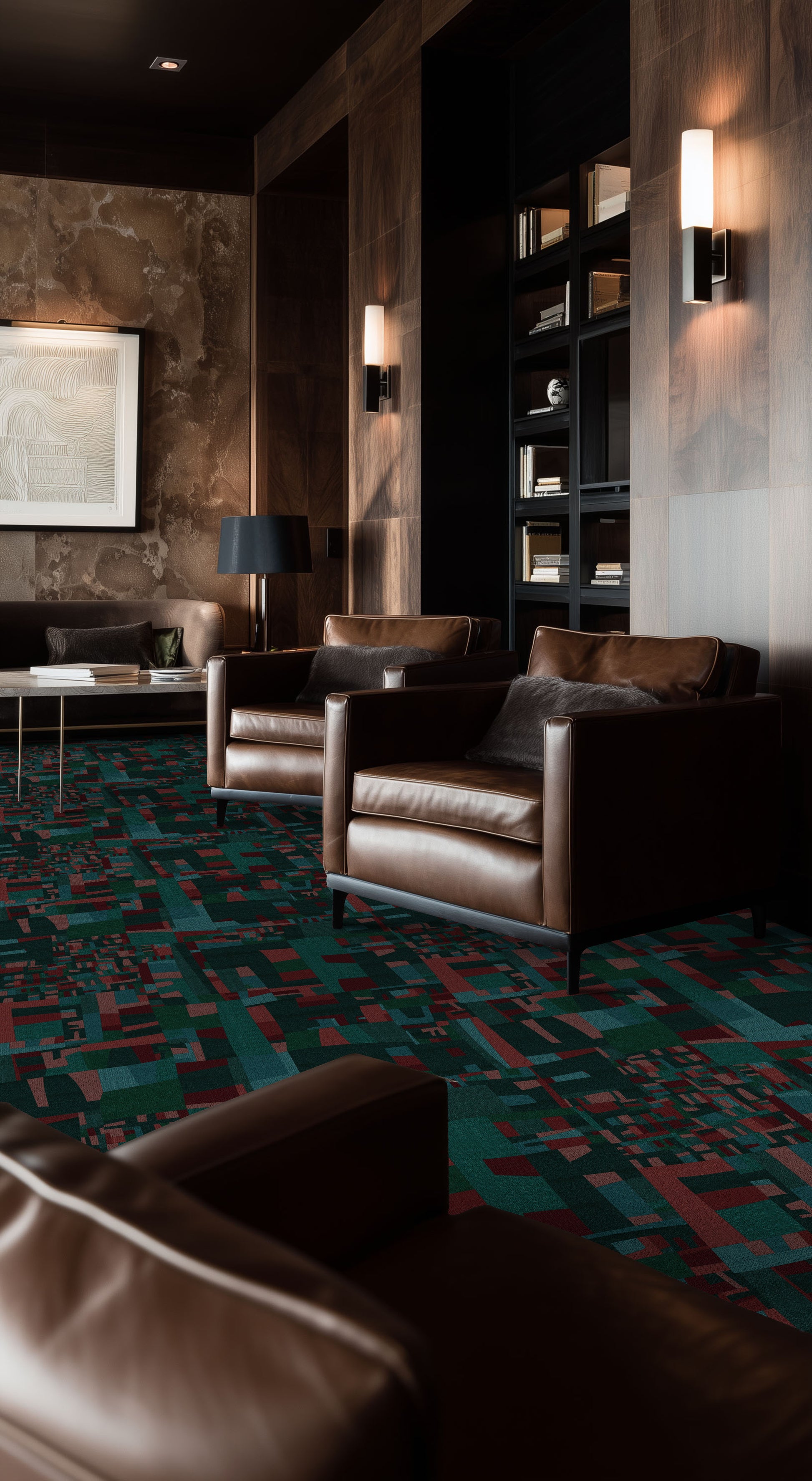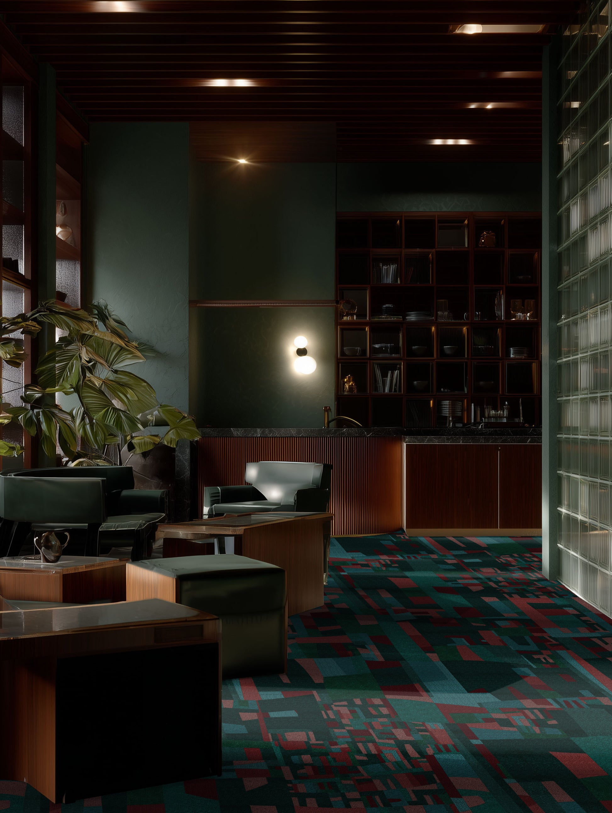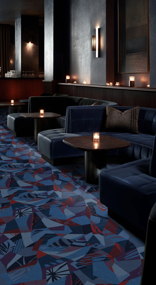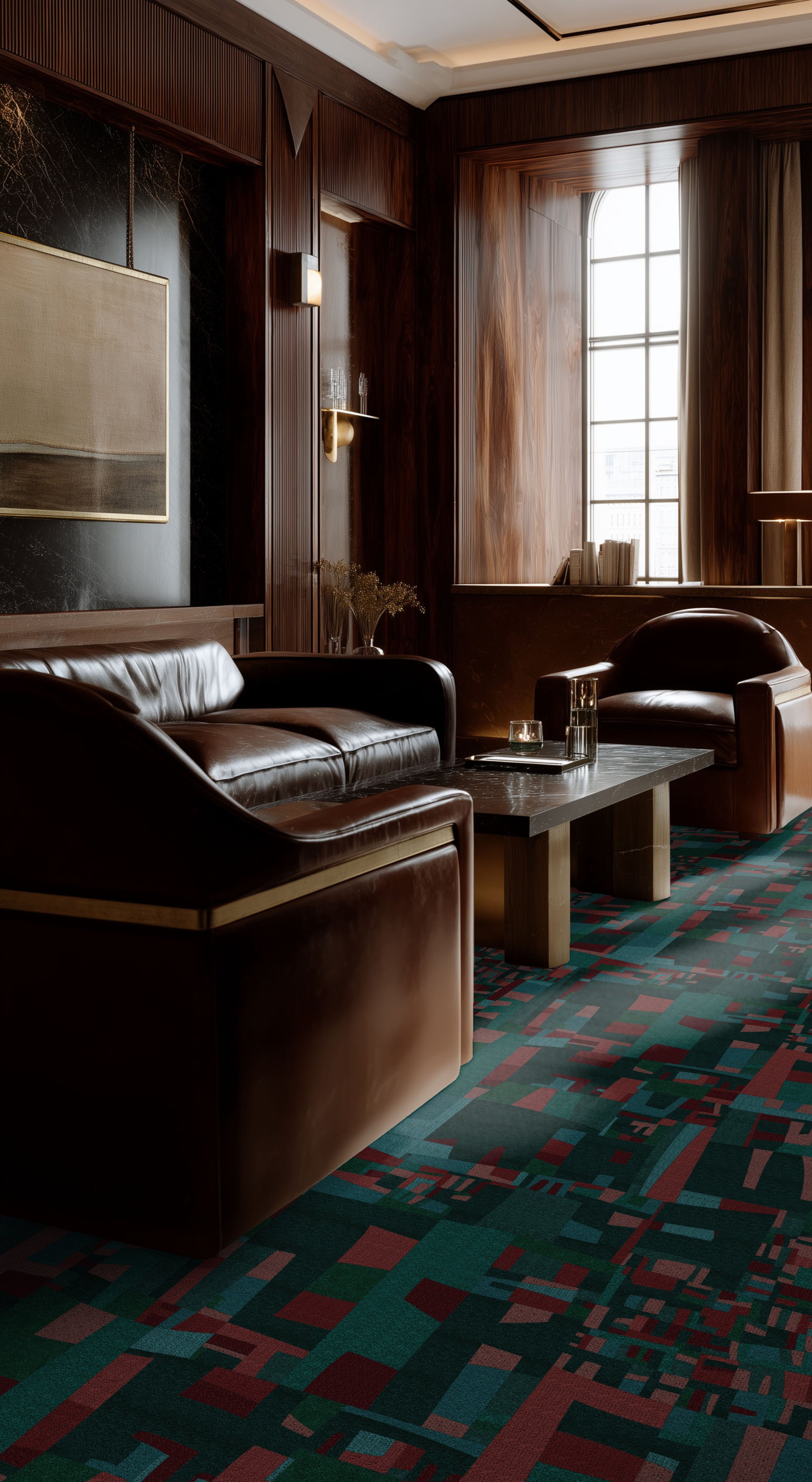 The pattern is bold yet balanced, ideal for large hospitality or corporate spaces where architectural storytelling meets artistic texture.